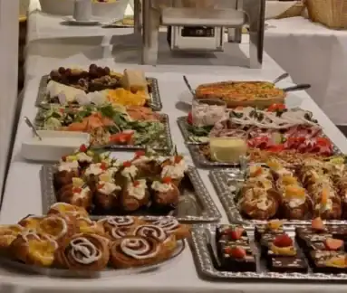Nyd en indbydende tapasbuffet med et stort udvalg af små, smagfulde retter. Her finder I alt fra fisk og delikate charcuterier til sliders, lune specialiteter og hjemmelavede dips. Afslut med et lækkert ostebord, søde småkager og friskbagt brød – perfekt til en hyggelig og afslappet spiseoplevelse.